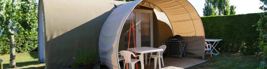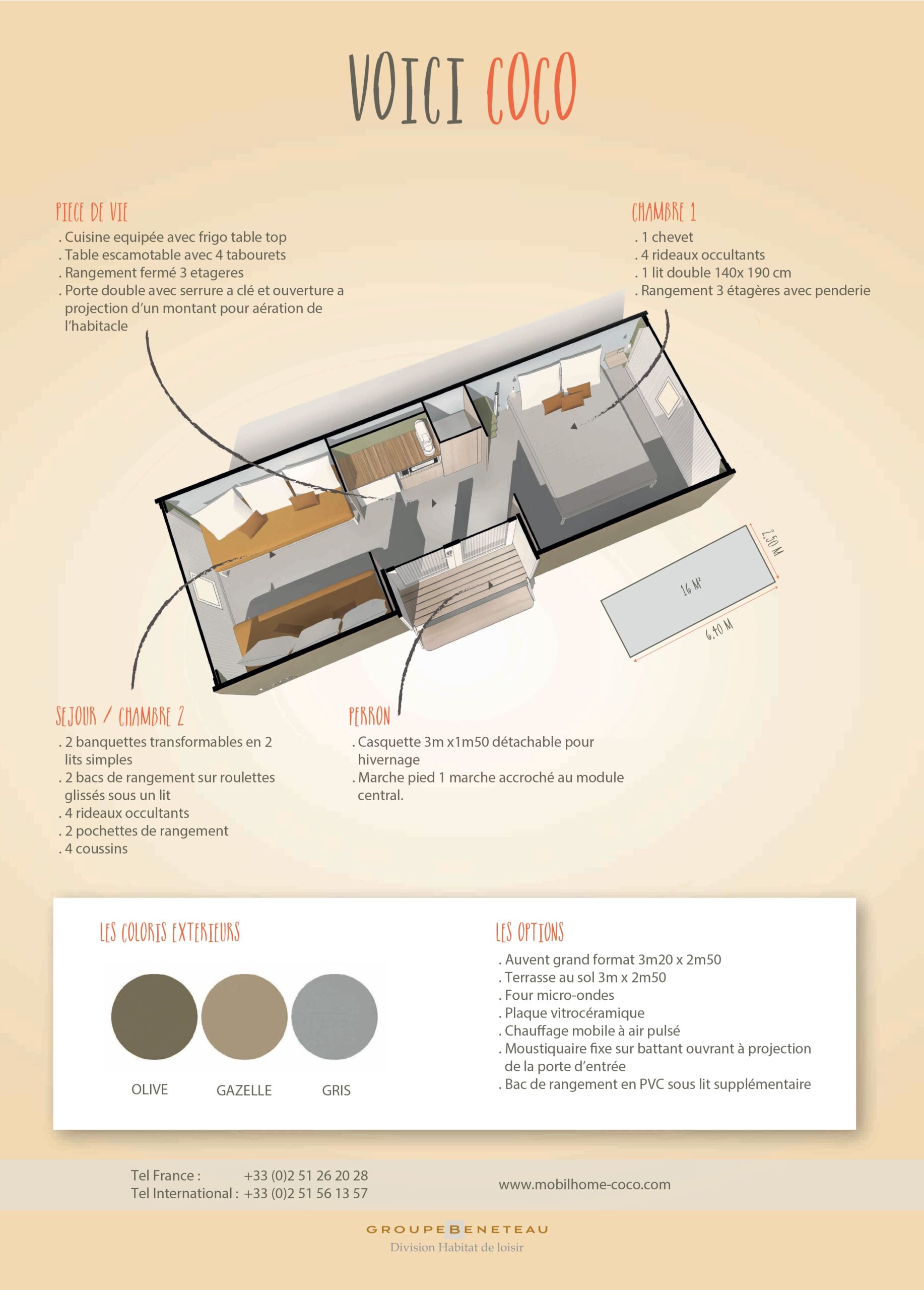 COCO c’est un mobilhome au forme ronde recouvert d’une toile. Ses murs sont rigides et isolés, sa porte d’entrée se ferme à clé. Il peut recevoir 4 personnes avec ses 2 chambres équipées de sommier avec matelas. Il n’offre pas de sanitaire mais une kitchenette équipée d’un four micro onde et d’un frigo. La vie en COCO se prolonge sur la terrasse sous l’auvent. COCO c’est nouvo !